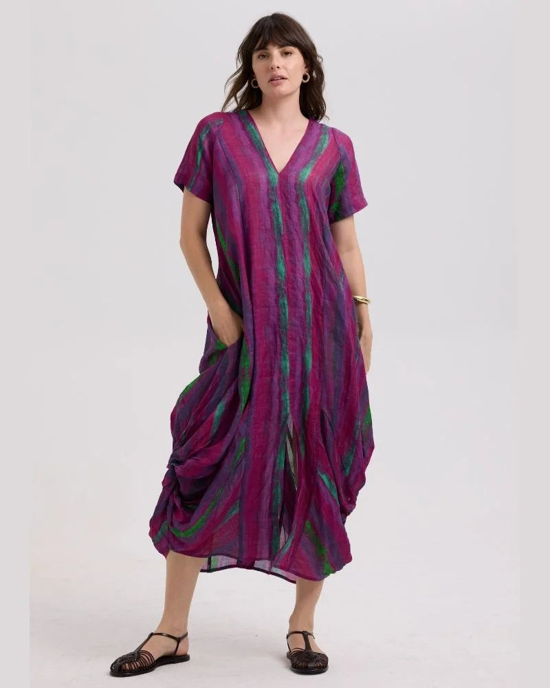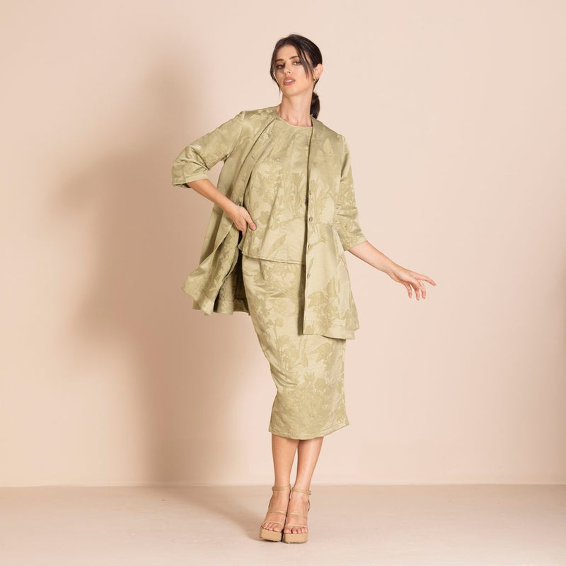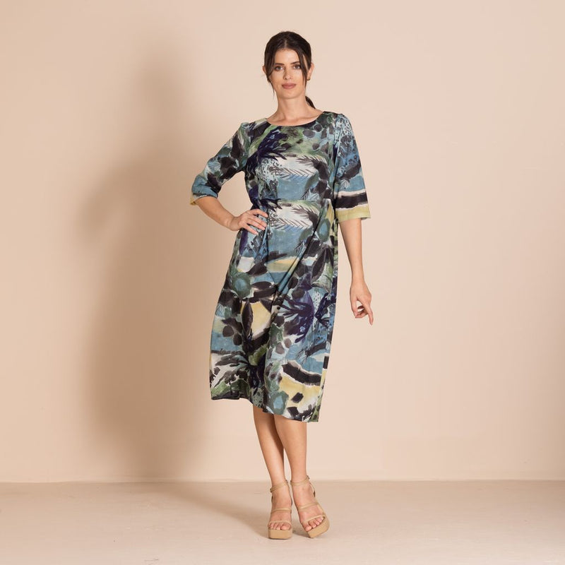 The Leende Top is a semi-sheer top with an elbow-length wide sleeve finishing in a tacked cuff. The crew neck has a back keyhole with a sustainably sourced Corozo nut button closure.